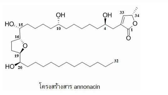 จะเห็นได้ว่าหน่วยงานสถาบันมะเร็งแห่งชาติ (National Cancer Institute) ของประเทศสหรัฐอเมริกามีความพยายามที่จะพัฒนาสารกลุ่ม annonaceous acetogenins เป็นยาต้านมะเร็ง เช่นเดียวกับสาร taxol ที่สกัดได้จากต้น Taxus brevifolia (Pacific yew หรือ western yew) โดยเริ่มโครงการตั้งแต่ปี ค.ศ. 1976 งานวิจัยพบว่าสารกลุ่ม annonaceous acetogenins มีฤทธิ์ยับยั้งเซลล์มะเร็งได้หลายชนิดในหลอดทดลอง และในสัตว์ทดลอง ซึ่งหน่วยงานที่รับผิดชอบหลักคือ มหาวิทยาลัย Purdue ในขณะเดียวกันทางประเทศเกาหลี (the Catholic University) ได้วิจัยพบว่าสารกลุ่มนี้มีฤทธิ์ต่อเซลลล์มะเร็งลำไส้และมะเร็งเต้านมดีกว่า สาร adriamycin ถึง 1,000 เท่า และไม่เป็นพิษต่อเซลล์ปกติ แต่จะเห็นได้ว่าจนถึงปัจจุบันงานวิจัยไม่ได้ก้าวหน้า ยังไม่มีงานวิจัยในระดับการศึกษาในคน (clinical trial) ทั้งนี้อาจจะเนื่องจากสารกลุ่มนี้มีความเป็นพิษสูงทั้งต่อเนื้อเยื่อสมองและ ไต และที่สำคัญสารกลุ่มนี้ในการที่จะพัฒนาเป็นยา จะต้องมีการต่อยอดในการสังเคราะห์ให้มีปริมาณมากเพียงพอ เมื่อพิจารณาถึงโครงสร้างของสารกลุ่มนี้ จะเห็นได้ว่าสาร annonaceous acetogenins เป็นสารที่มีโครงสร้างเป็น long chain fatty acid ที่มีน้ำหนักโมเลกุลสูง และที่สำคัญคือมี chiral center ที่ carbon atom หลายตำแหน่ง ตัวอย่างเช่น สาร annonacin มี chiral center 7 ตำแหน่ง คือ carbon ที่ 4, 10, 15, 16, 19, 20 และ 34 ซึ่งเป็นการยากมากที่จะสังเคราะห์สารให้ได้ stereochemistry เหมือนสารที่ได้จากธรรมชาติ และสาร annonaceous acetogenins ที่มี chiral center ต่างกันเพียงจุดเดียวก็จะมีฤทธิ์แตกต่างกันเป็น 1,000 เท่า 100,000 เท่า จะเห็นได้ว่าจากข้อมูลข้างต้นคงเป็นปัญหาหนึ่งที่ทำให้การพัฒนาสาร annonaceous acetogenins เป็นยาต้านมะเร็ง จึงยังไม่บรรลุผลจนถึงปัจจุบัน